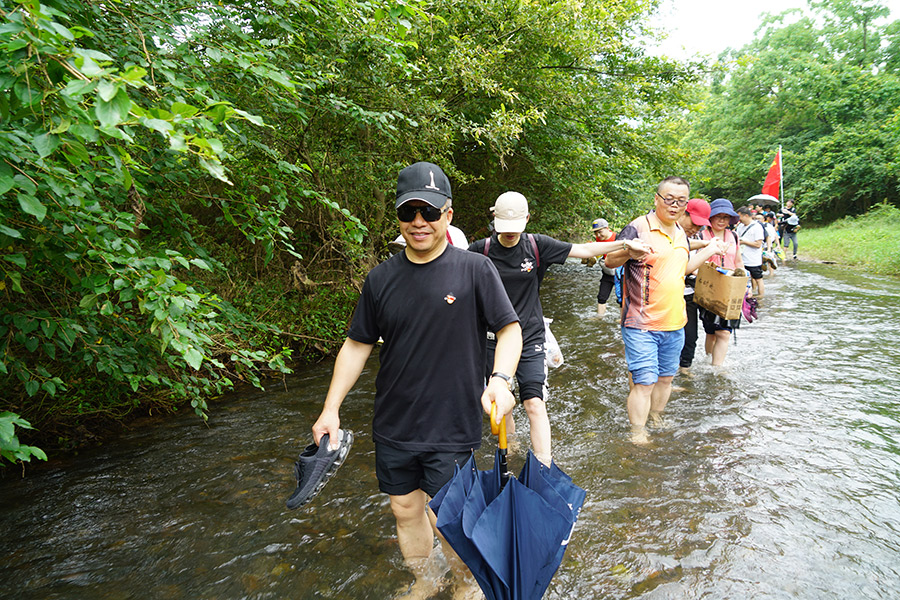 大雨過后,烈日當(dāng)空,地表溫度迅速上升,空氣中的水蒸氣增多,汗液難于蒸發(fā),面對濕熱天氣,大家義無反顧的前進(jìn),衣服濕了又干,干了又濕。中午14點,隊伍進(jìn)入一片樹林,起初地勢較為平坦、道路開闊……漸漸地,地面開始凹凸不平,有了越來越多的水坑,道路開始變窄,一條小溪攔住了隊伍。大家紛紛脫鞋下水,手拉著手、攙扶著后面的同志在溪水中行進(jìn),本著不能讓任何一個同志掉隊的信念,整個團(tuán)隊相互鼓勁、相互扶持,克服困難,攜手踏過這段溪流。